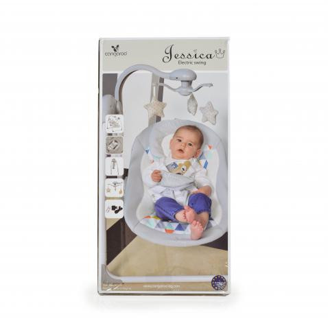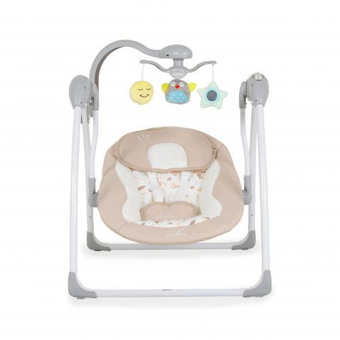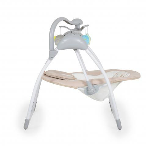 6 hónapos korig és 9 kg súlyú gyermekek számára alkalmas; 5 lengésszint - világításjelzőkkel jelölve; 3 lengési idő beállítás - 8, 15 és 30 perc; 12 tiszta dallam és 5 természethang. Az ülésnek 2 pozíciója van - fekvés a pihenéshez és félállás a játékhoz. A készlet tartalmaz elektromos játékrudat 3 játékkal a baba vizuális stimulálásához és távirányítót; A gyerekhinta adapterrel vagy elemmel működik.