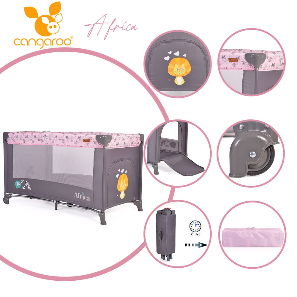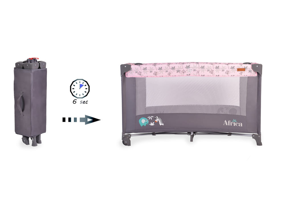 Az AFRICA 1 szintes utazóágy egy tökéletes választás minden kisgyermekes család számára. A rózsaszín designnal készült, ez a gyerekágy biztonságos és kényelmes helyet biztosít a babádnak alvás vagy játék közben, legyetek otthon, vagy éppen utazás közben. A 14 kg-os súlya hozzájárul a stabilitásához és könnyen mozgatható. Az ágy mellett egy ingyenes rágóka is jár, amit a babád nagy örömmel fog majd használni fogzás idején. Az AFRICA utazóágy egyszerű és gyors szerelést tesz lehetővé, így mindig kéznél lesz, ha szükséged van rá.