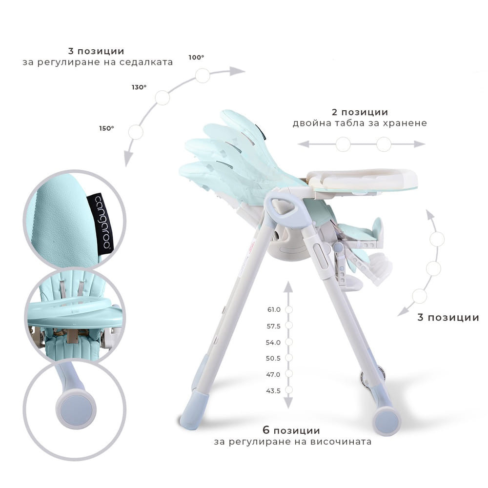 Az I EAT etetőszék a Cangaroo márkától egy igazán praktikus kiegészítő a babák étkezési időszakához. A kék színű, modern dizájnú etetőszék 6-36 hónapos korú babák számára ideális, és maximum 15 kg-ig terhelhető. Az I EAT etetőszék magassága állítható, így minden gyermek számára kényelmesen használható, az étkezések pedig sokkal könnyebben mennek. Ráadásul összecsukható, ami azt jelenti, hogy könnyedén eltehető, ha nem használják, így tökéletes megoldás a helytakarékos otthonokba is. A biztonsági övvel és a stabil szerkezettel ellátott etetőszék biztonságos környezetet biztosít a babának, míg a könnyen tisztítható anyaga egyszerűvé teszi a takarítást a huncut kis kéz nyomán maradt ételmaradványok után.