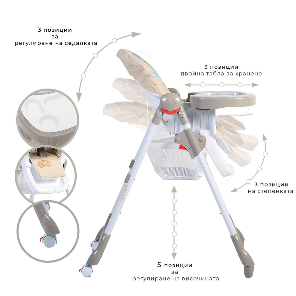 • Állítható Magasság: Az etetőszék magassága több fokozatban állítható, így alkalmazkodik a különböző asztalokhoz és a gyermek növekedéséhez.