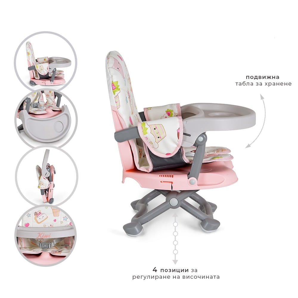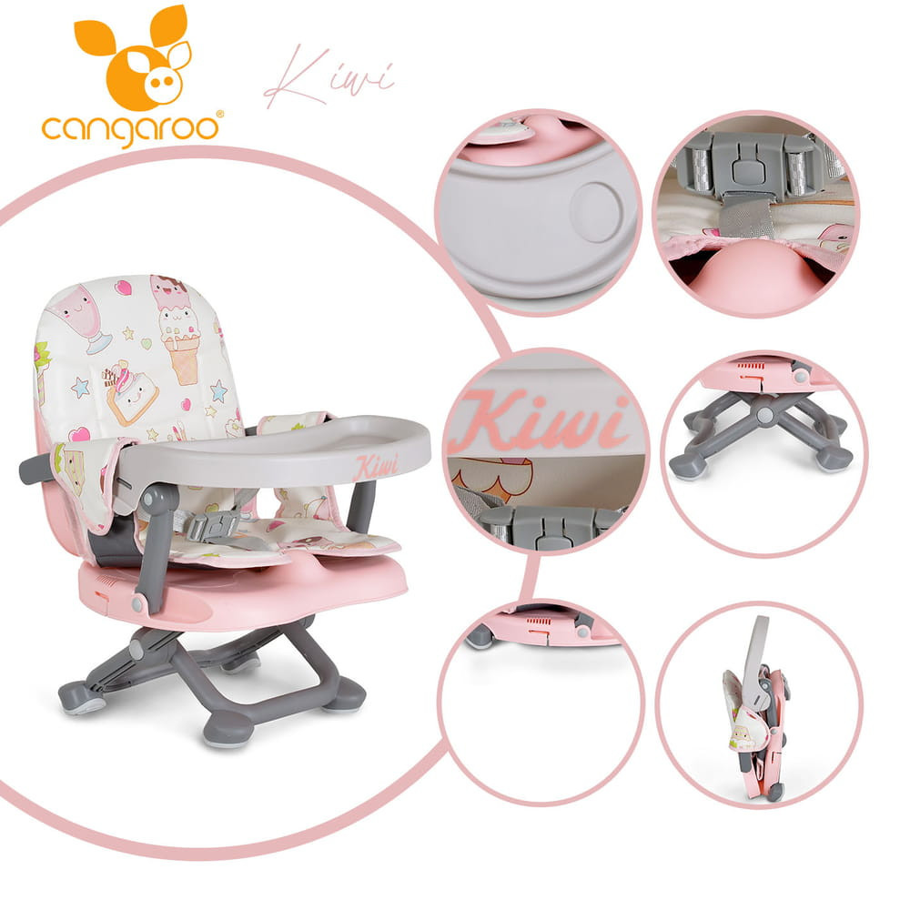 A Cangaroo Kiwi Cupcakes nevű hordozható etetőszék tökéletes választás, hogy a kicsik is részt vehessenek az étkezéseknél. A beépített, állítható székszíjaknak és a hárompontos biztonsági övnek köszönhetően a gyerekek kényelmesen és biztonságban ülhetnek a felnőttek asztalánál. Mindemellett a szék SÜTIS mintázata teszi még vidámabbá az étkezéseket. Ez az etetőszék nem csak praktikus, de stílusos is, így könnyedén beilleszkedik bármilyen környezetbe.