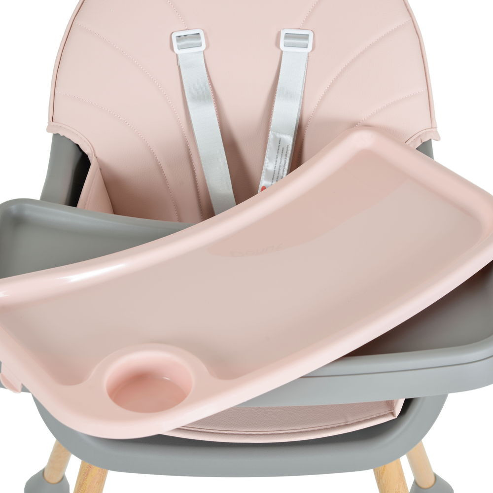 A Donut etetőszék 2 az 1-ben klasszikus, letisztult dizájnnal rendelkezik, 2 rétegű etetőtálcával, pohártartóval és 2 pozícióban állítható, 5 pontos rögzítő rendszerrel, lábtartóval. A lábak fából készült lenyomattal, a párna pedig PU bőrből készült.