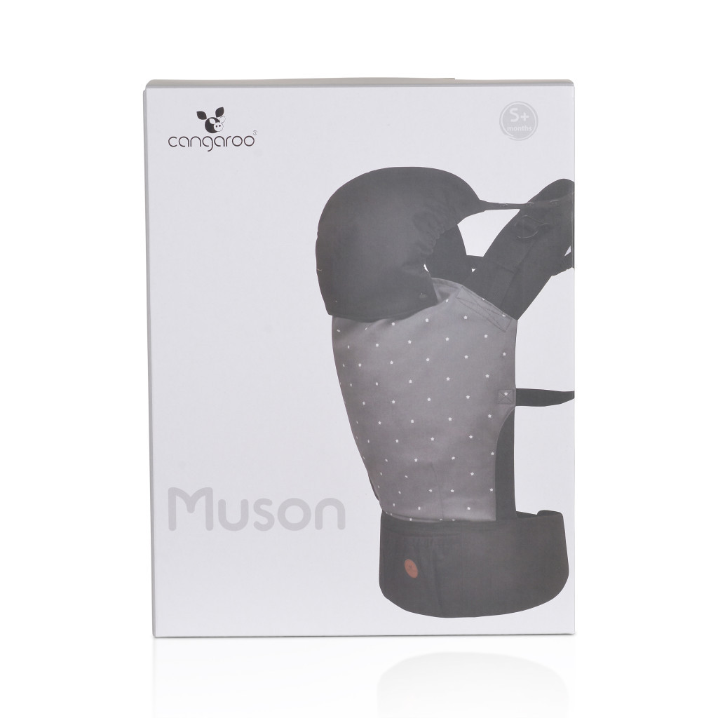 A Muson babahordozó 5 hónapos és legfeljebb 15 kg-os csecsemők számára alkalmas. A fő részek és a kapucni 100% pamutból készültek. Két pozícióban használható - a szülővel szemben vagy a hátán. Állítható vállpántokkal, megerősített derékszíjjal és dupla biztonsági csattal rendelkezik a baba biztonsága érdekében. A kiegészítők számára kialakított zseb és a levehető kapucni extra kényelmet és komfortot biztosít. A termék könnyen karbantartható és kézi mosásra alkalmas. Vidám pöttyös anyaggal.