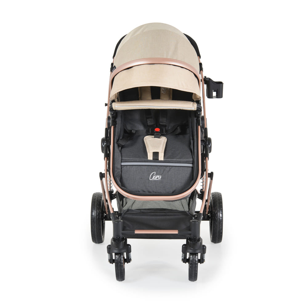 A babakocsi timsós. váz és hátsó, első és középső felfüggesztések. Átalakítható hordágyká újszülöttek számára 6 hónapos korig, és ülőkévé 6-36 hónapos gyermekek számára. Ötpontos övrendszer puha vállpárnákkal. Az ülés háttámlájának három pozíciója van: ülő, félig fekvő és fekvő. A háttámla helyzete övvel állítható. A babakocsi lombkorona további védőszemüveggel rendelkezik. A lökhárító rúd levehető. Egyérintéses fékrendszer azonnali fékezéssel. A lábtámasz magassága öv szerint. A babakocsi könnyen és gyorsan össze- és széthajtható. Anyatáskával. A gyermek kényelmét szolgálja a termék, és egy további betétet is tartalmaz az üléshez.