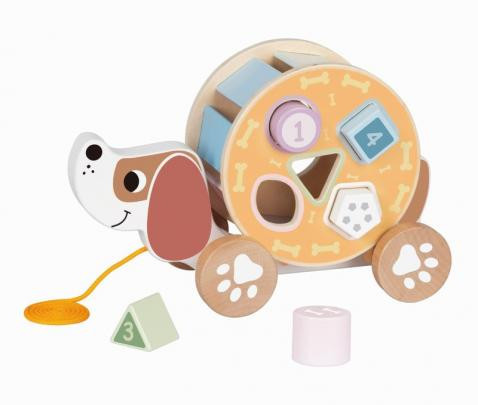 Formaberakós kiskutya, húzózsinórral. 5 forma bedobó lyukkal és hozzá figurákkal, számokkal