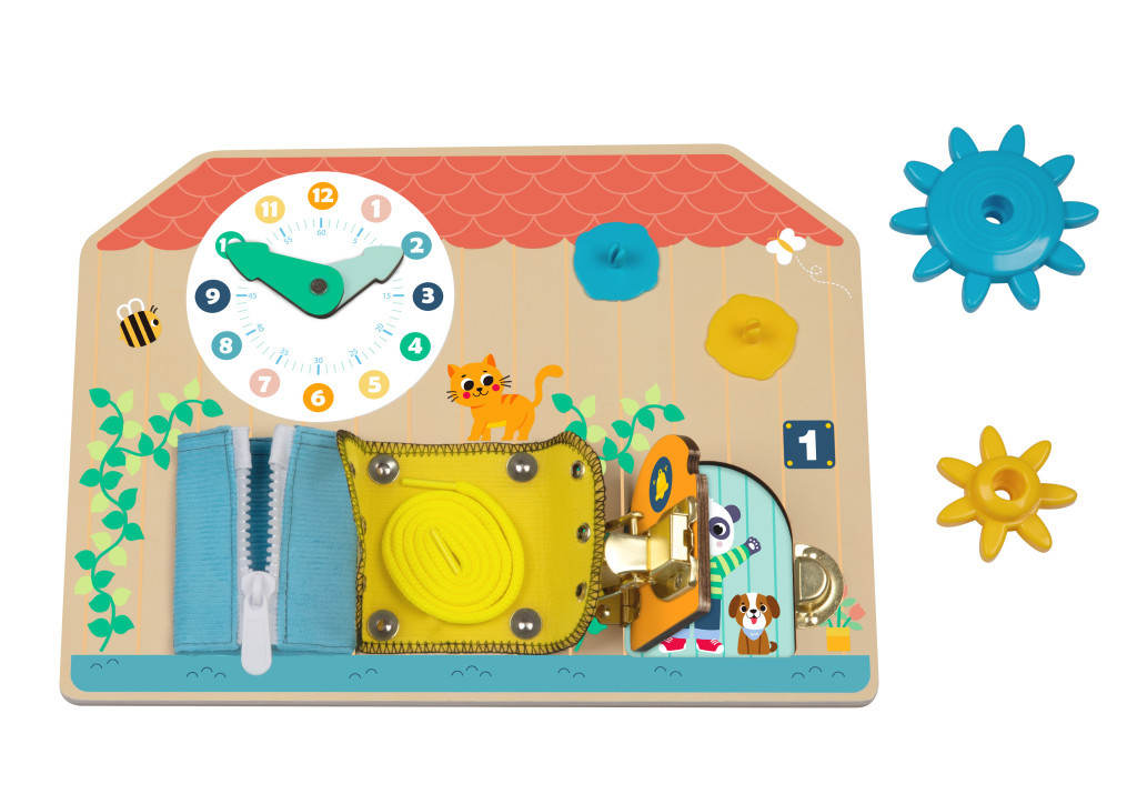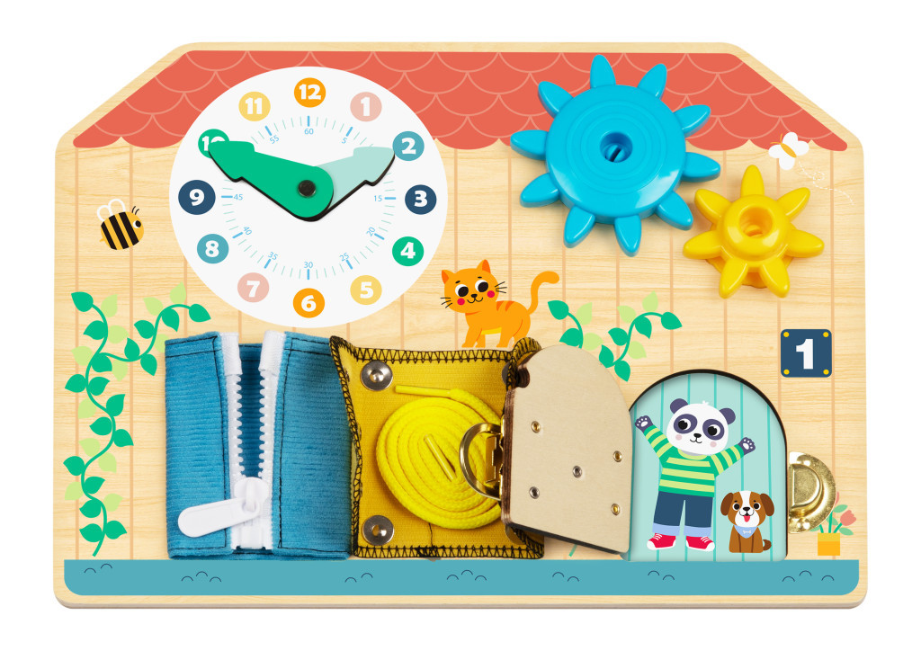 Ez a fa foglalkoztató tábla egy színes és szórakoztató játék, amely igazi kalanddá varázsolja a tanulást. Ház alakú, vidám állatos illusztrációkkal, és számos elemet tartalmaz - egy mozgó mutatókkal ellátott órát, forgó fogaskerekeket, cipzárt a nyitáshoz és záráshoz, egy lakatot és egy kis ajtót, amely mögött a gyermek egy rejtett képet fedezhet fel.