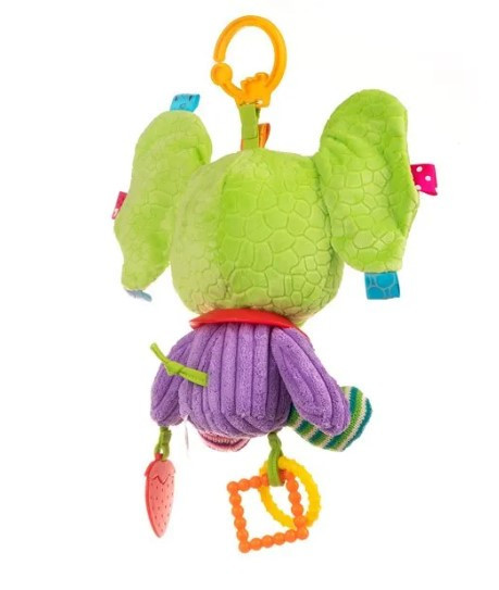 Ez a gyönyörű, pasztell színű házi kedvenc testét különböző textúrájú anyagokból készítették, ami stimulálja a gyermek tapintási érzékelését és elősegíti kognitív képességeinek fejlődését. Ezenkívül rágcsálnivalók és egy csengő is található rajta, amely az elefántocska hasában van elrejtve.