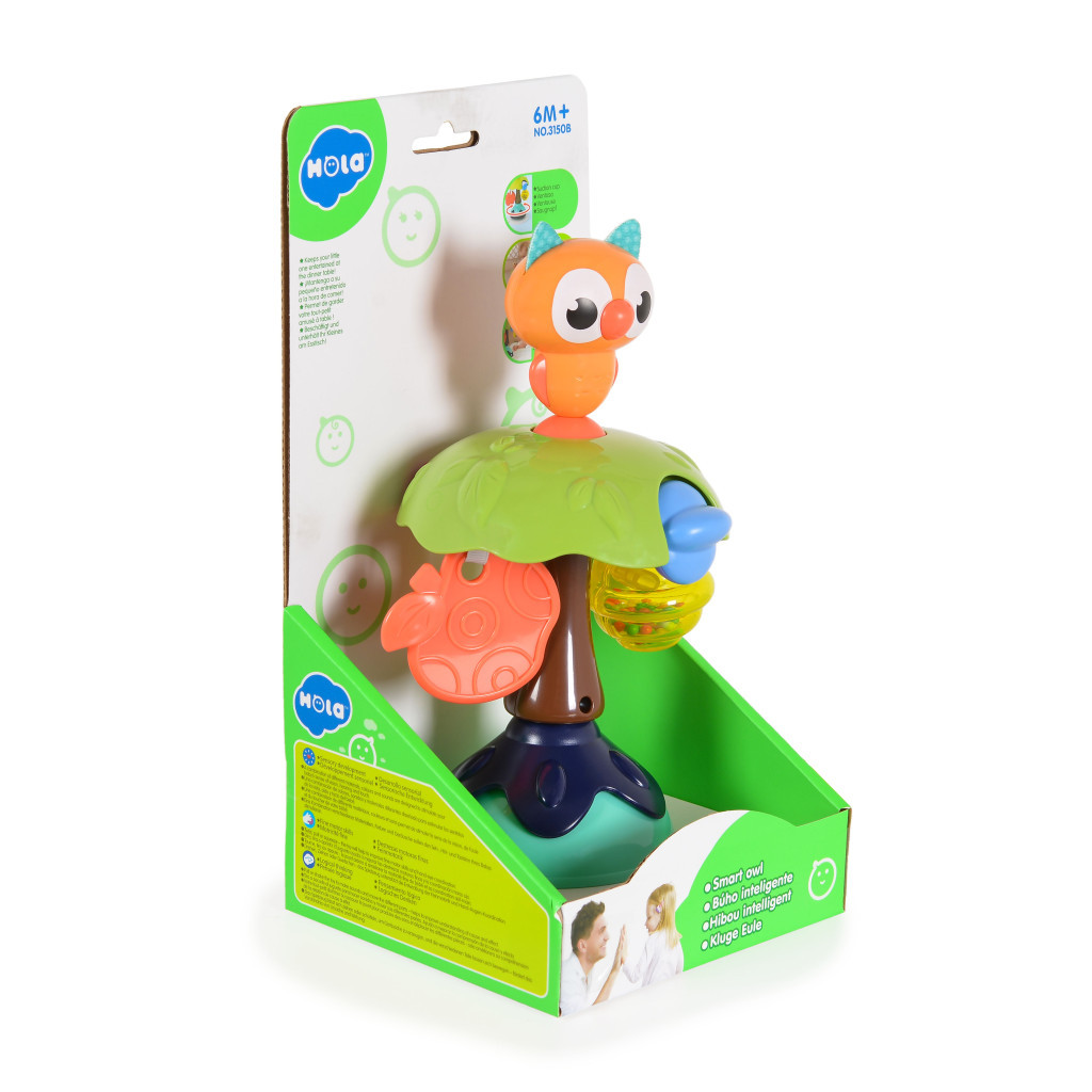 Egy vidám és színes, bagoly alakú csörgő, amely két funkciót ötvöz – csörgő és játék, melynek talpa asztalra, etetőszékre vagy más sima felületre rögzíthető. Ez stabilan tartja a játékot, lehetővé téve a baba számára, hogy forogjon, rázkódjon és felfedezze. Serkenti a finommotoros készségeket, a koordinációt és az érzékszervi fejlődést. 6 hónaposnál idősebb gyermekek számára alkalmas.