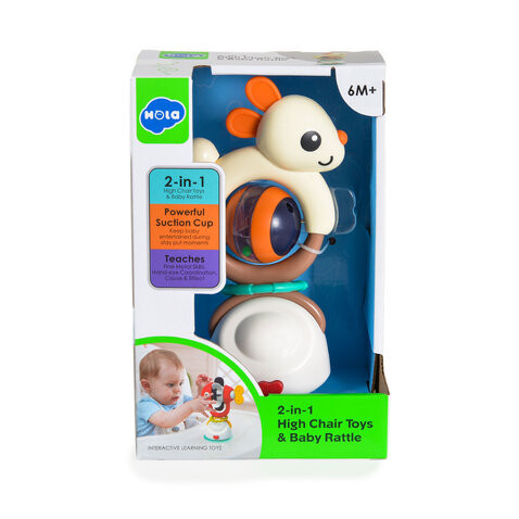 2 az 1-ben Etetőszékhez rögzíthető játék és csörgő rágóka. Etetőszékre rögzíthető igy segit lekötni a gyerek figyelmét az etetés idejére. Erős tapadókorongos rögzítési mód. Fejlesztik a színek és a formák a szem-kéz koordinációt.